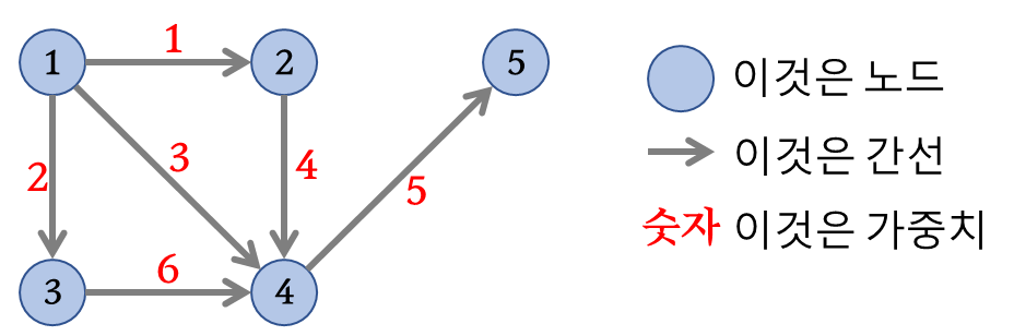 이렇게 비용이 있는 그래프를 간선에 가중치가 있다해서 가중치 방향 그래프라고 합니다.